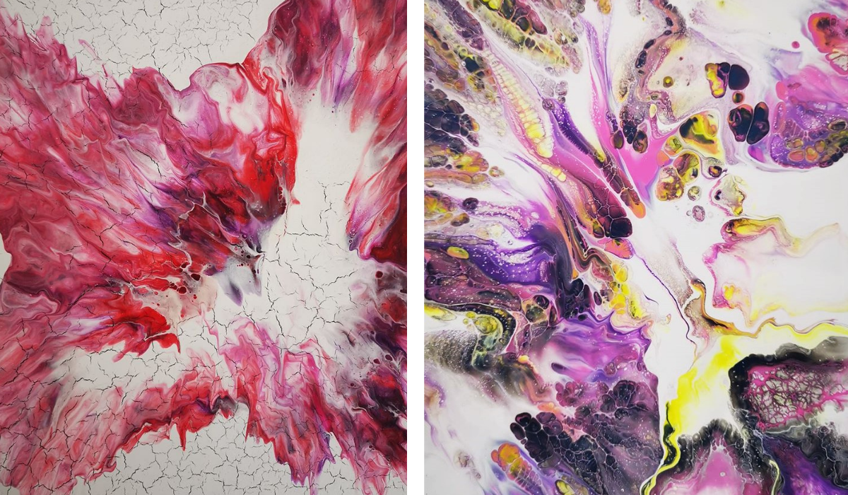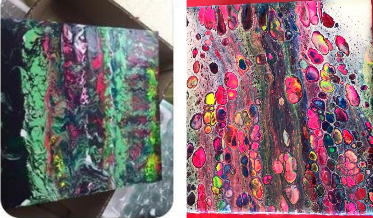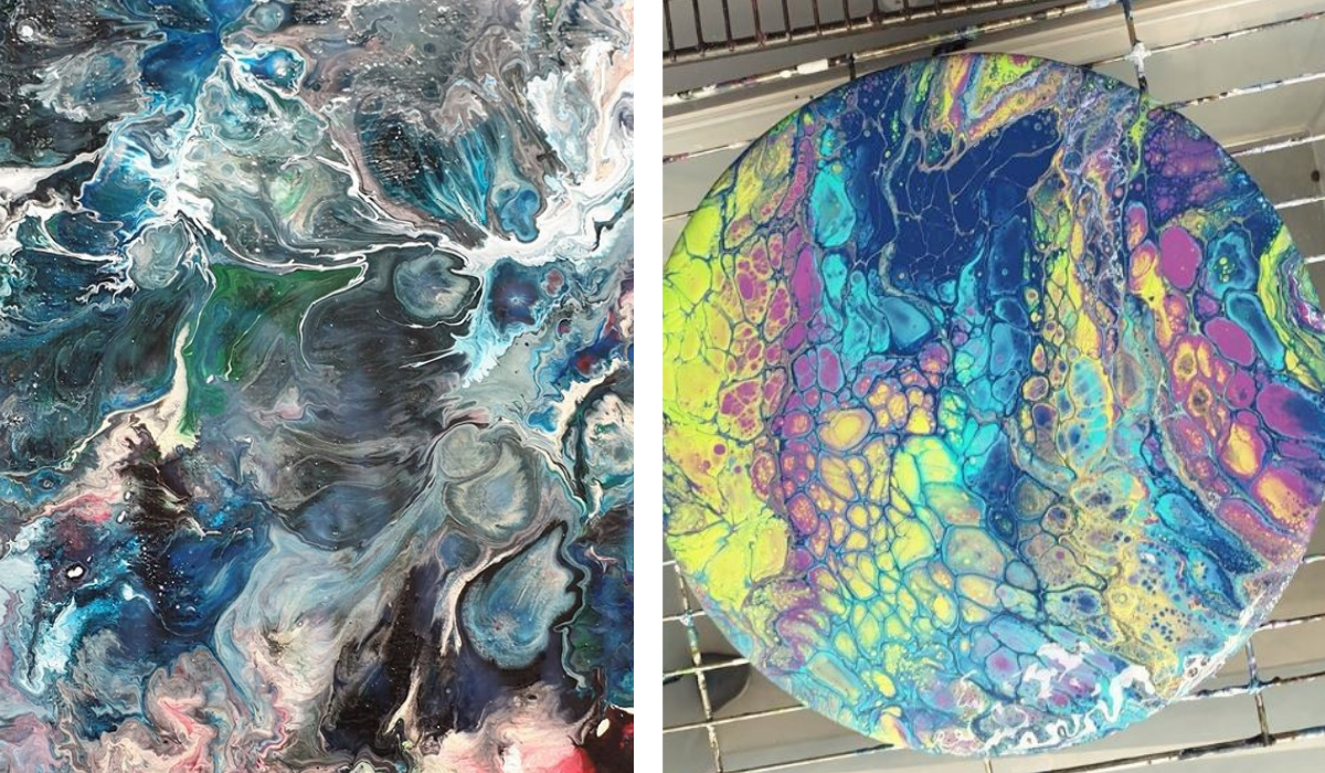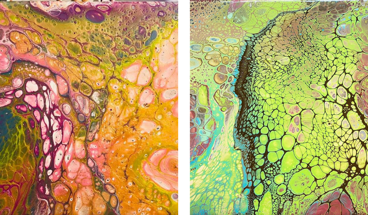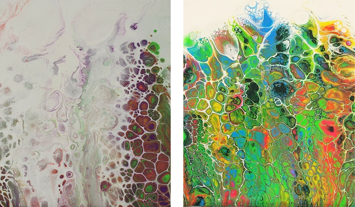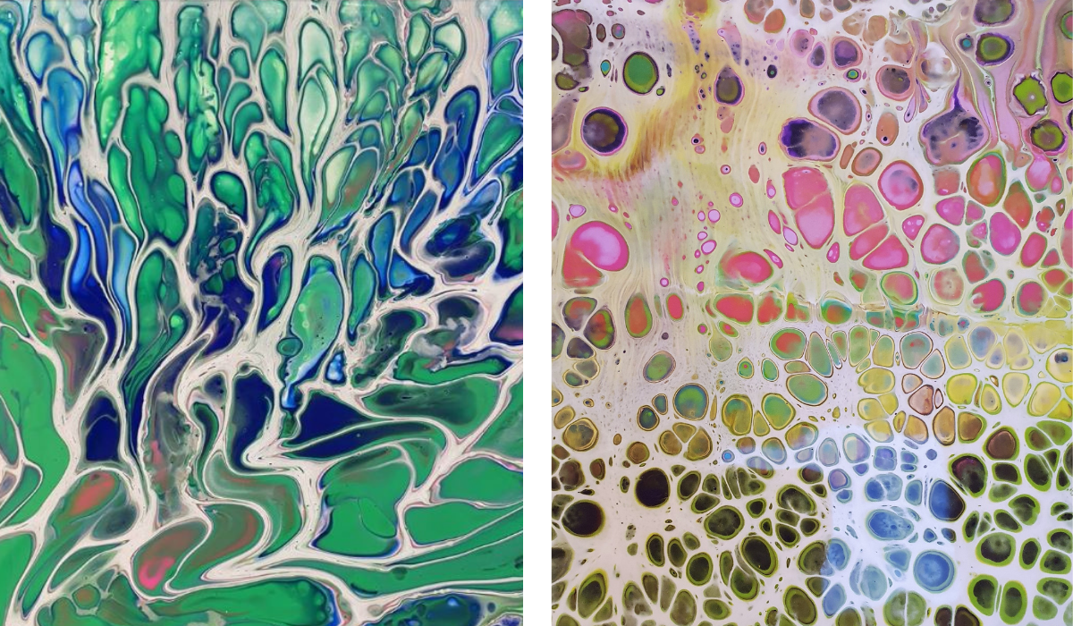 I wanted to accelerate my development. I wanted to have interaction and feedback, which you can’t get from watching YouTube videos! I wanted to save money in the medium term by doing pours so not wasting canvases and paint! I wanted to have support and encouragement, so I didn’t give up when I got frustrated! And I wanted to find a fun, honest team so that it felt like a sociable hobby as I’m shielding.