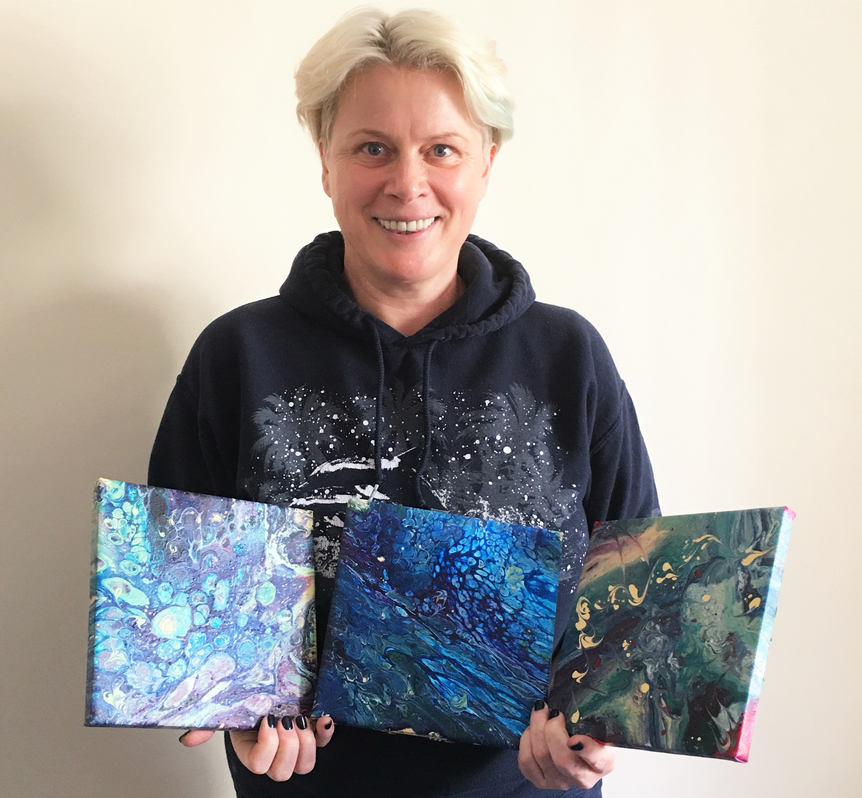 Where do I start?! At the beginning is always best… or not! In the beginning, there were storms stirred in plastic cups to create the perfect consistencies, waterfalls of acrylics splashed onto canvases in the vain hope that a masterpiece would emerge. The result was a catastrophic cacophony of cr@ap... What was I to do? Lo! To the east (I live in the west), a star glimmered on the horizon ‘twas Monique Oliver Fluid Art Masterclass. Here I am today producing such quality artwork that even my daughter puts it on her walls.