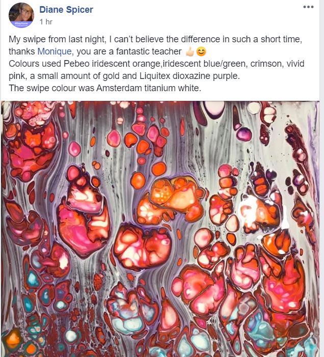 Having already wasted money on expensive courses that promised much and delivered little, I was so happy when I found Monique’s Fluid Art Masterclass. Not only is it very affordable, I learnt so much in the first week that I can’t wait to get stuck into the rest of the course. Monique is an excellent tutor and very approachable and has already saved me both time and money.